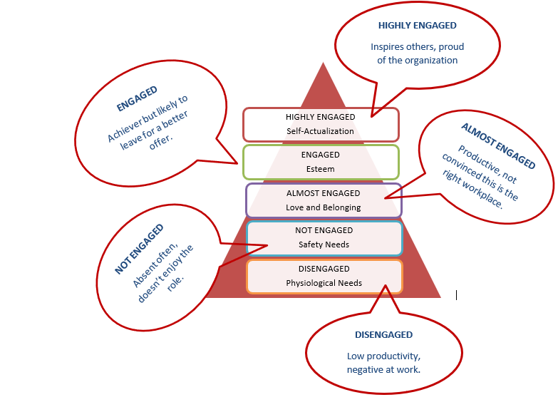 There is where employees are quite productive and they have formed friendships, connections and appreciate those they work with. They are not quite fully engaged as they are curious to know what other career opportunities are available outside the organization. This could be related to total compensation or career opportunities. While physiological needs are met and they feel safe at work, they could be in search of something more that the organization may not be able to offer.